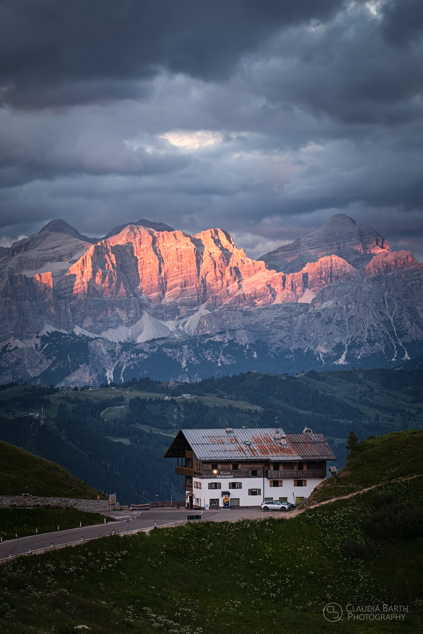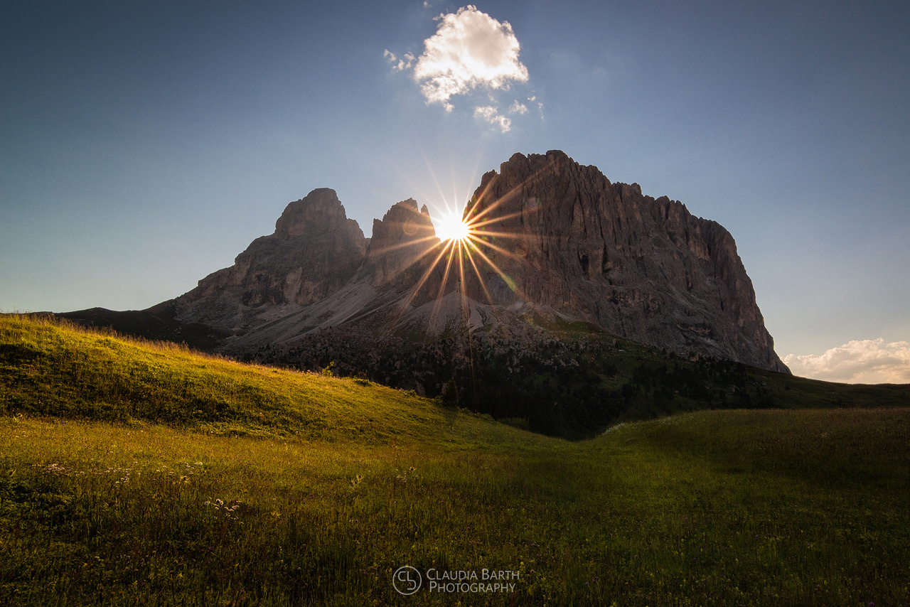 Sonnenuntergang am Grödner Joch mit Blick zum Langkofel